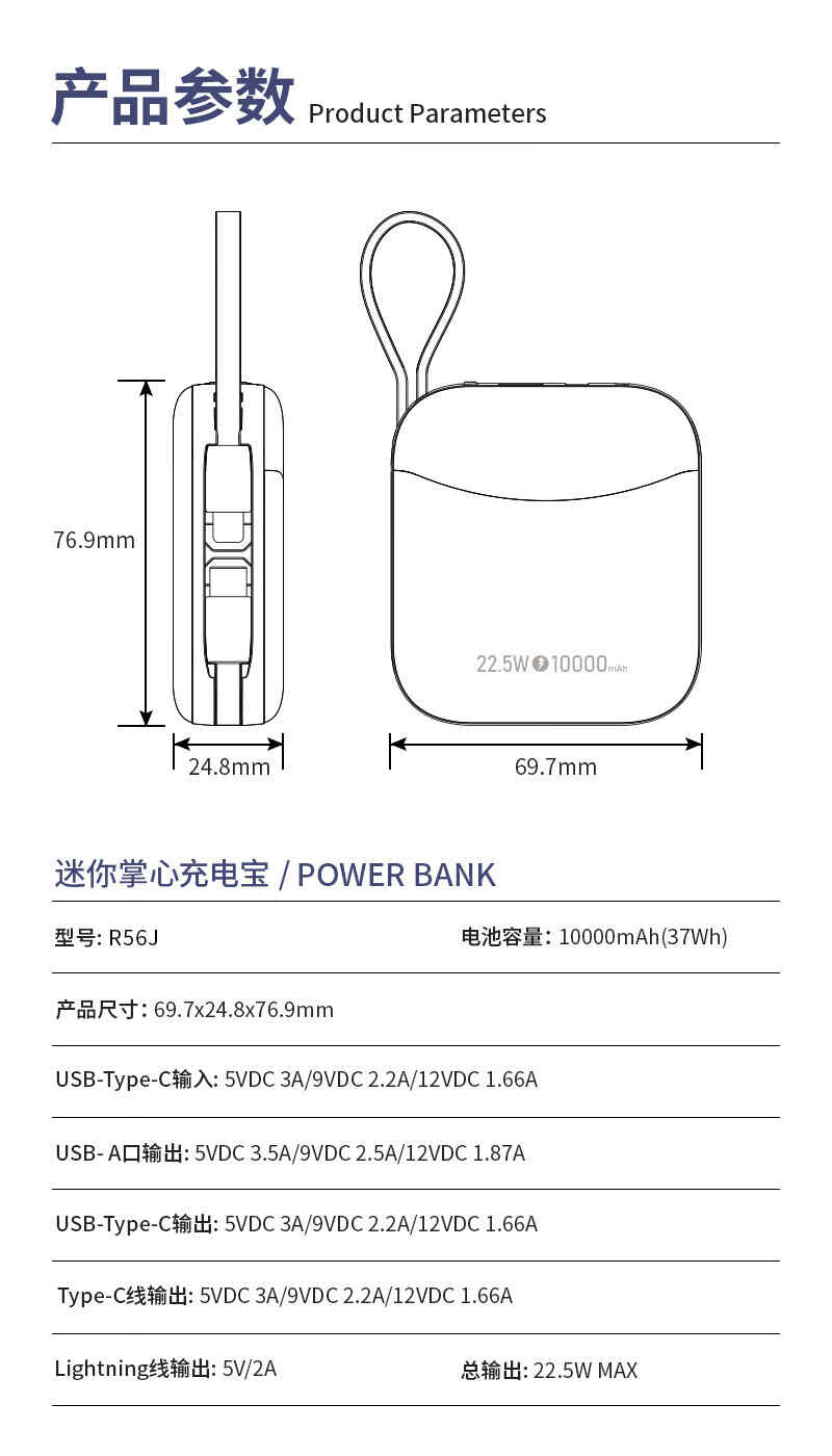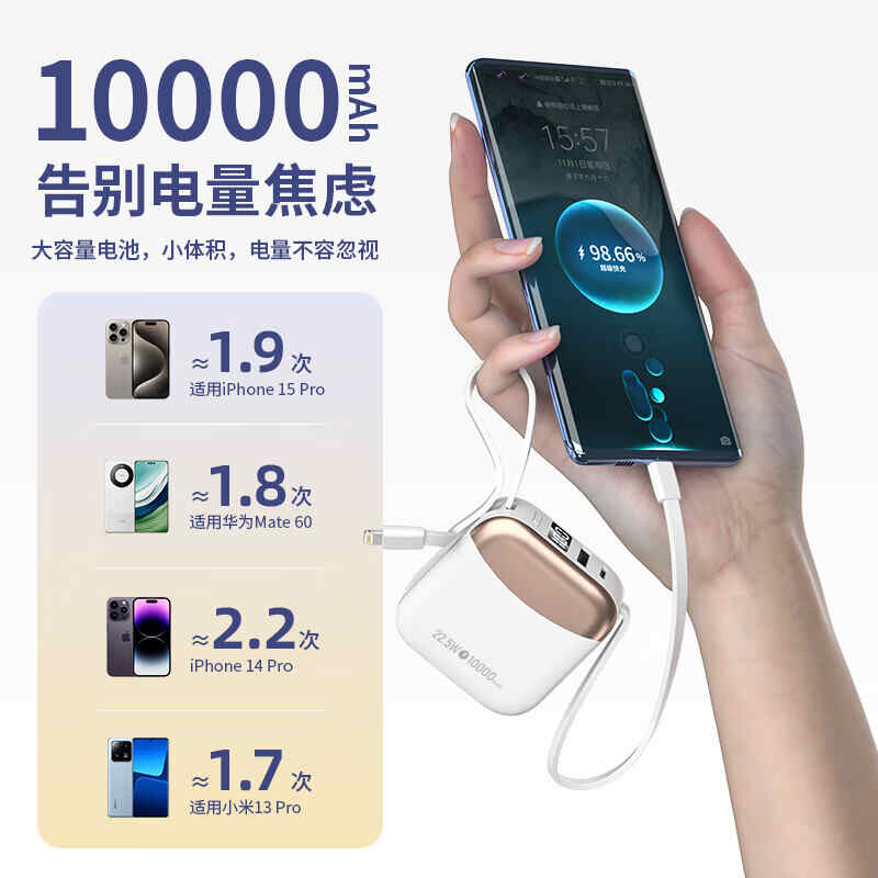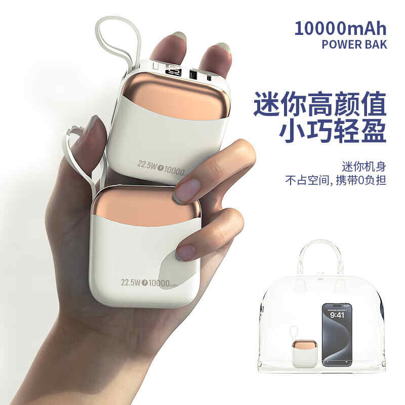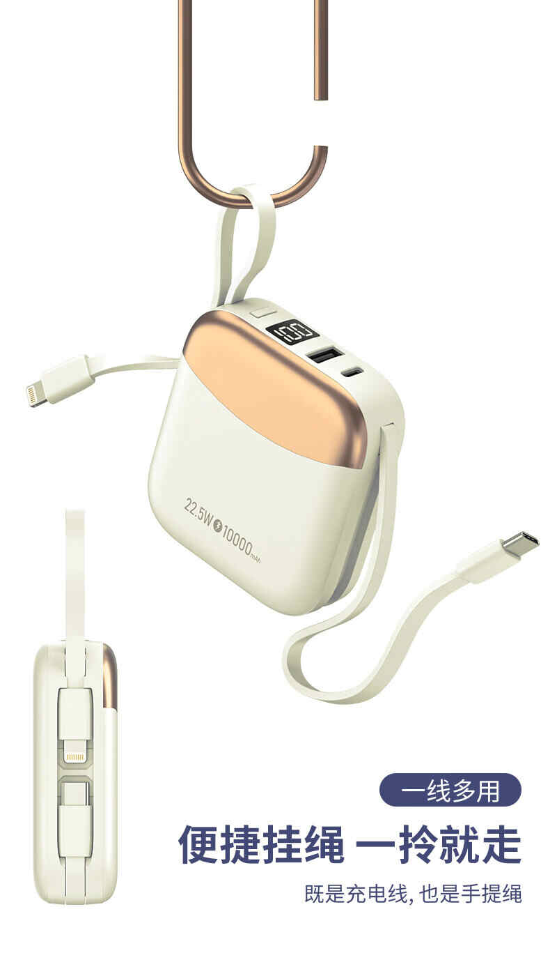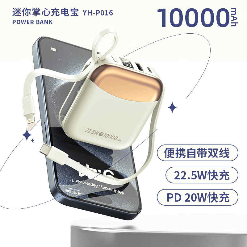 HYUNDAI自带线无线充移动电源10000mah超薄小巧22.5W快充R56J充电宝