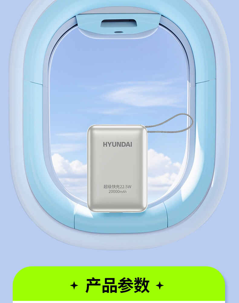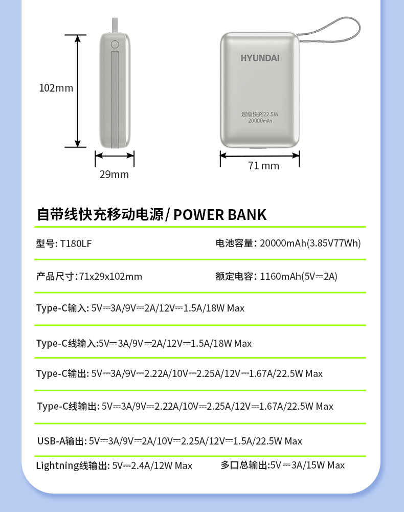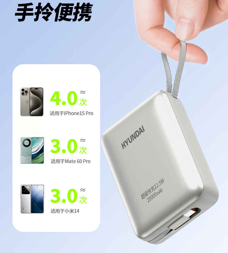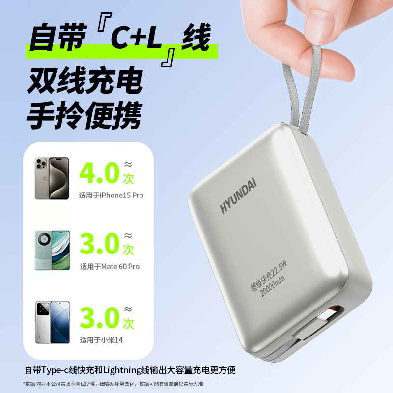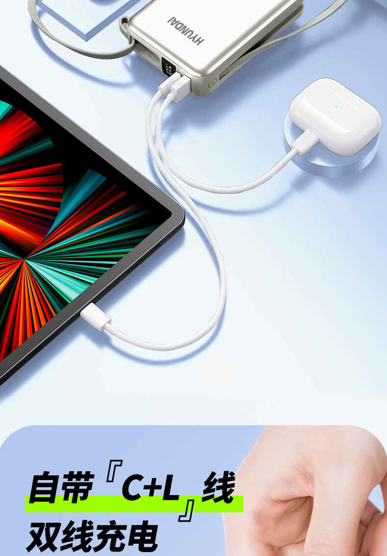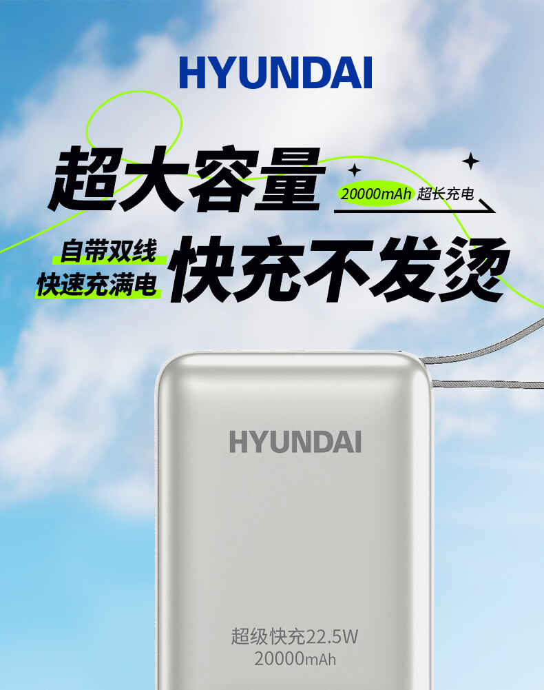 HYUNDAI 自带线快充移动电源20000毫安大容量电源22.5W快充 T180LF充电宝