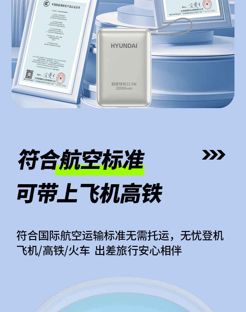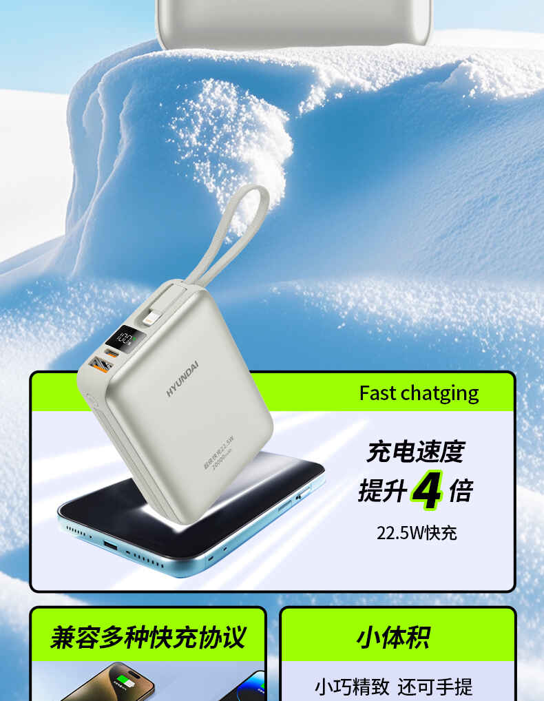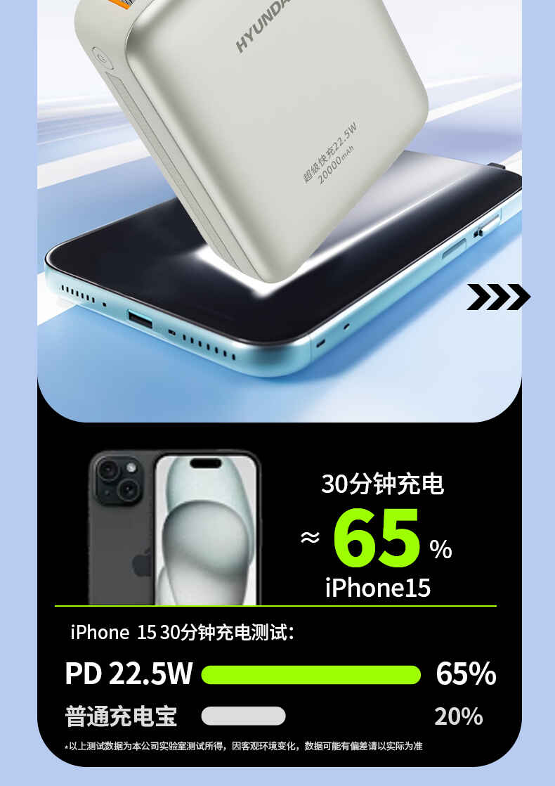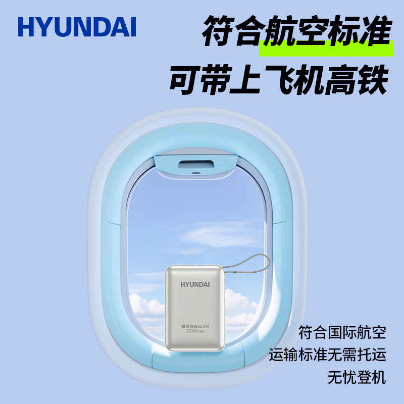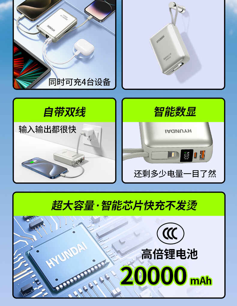 HYUNDAI 自带线快充移动电源20000毫安大容量电源22.5W快充 T180LF充电宝